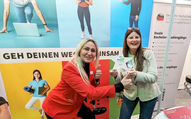 Auf der Stuzubi im Frühjahr 2023 in Berlin schnitt die DHfPG am besten bei den Jugendlichen ab. „Auf so einer großen Studien- und Ausbildungsmesse zum informativsten Stand gekürt zu werden, ist für uns eine hohe Auszeichnung. Wir freuen uns sehr über diese Trophäe und bedanken uns herzlich bei den Schülerinnen und Schülern aus Berlin für ihr Votum“, sagt Anja Wanjek von der DHfPG.
